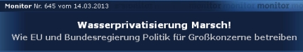 17.03.2013 00:05 Schwarzer Humor? Merkels CDU betreibt falsches Spiel - Wasserprivatisierung Marsch! Wie EU und Bundesregierung Politik für Großkonzerne betreiben - Georg Restle: „Als wir im Dezember über die Geheimpläne der Europäischen Union zur Privatisierung der Wasserversorgung berichteten, da konnten auch wir nicht ahnen, welche Welle wir damit lostreten. 1,3 Millionen Menschen in ganz Europa protestieren mittlerweile gegen die Pläne aus Brüssel - es ist das erste große europaweite Volksbegehren. [Quelle: wdr.de] JWD Man versprach nachzubessern - und bekam dabei sogar Unterstützung von der CDU. Es könnte also eine tolle Erfolgsgeschichte der europäischen Demokratie sein, die Ihnen Jan Schmitt, Kim Otto und Nikolaus Steiner jetzt erzählen. Könnte! Aber leider ist es eine Geschichte, die sehr viel verrät über die Verlogenheit von Politik rund um ein Milliardengeschäft. Dabei geht es nicht um irgendwas, sondern um eines der wichtigsten Güter der Menschheit: um Wasser.“ [..] Link zum Sendungsvideo bei ' wdr.de ' ..hier ![]() Screenshot Link zum Sendungsbeitrag als PDF ..hier